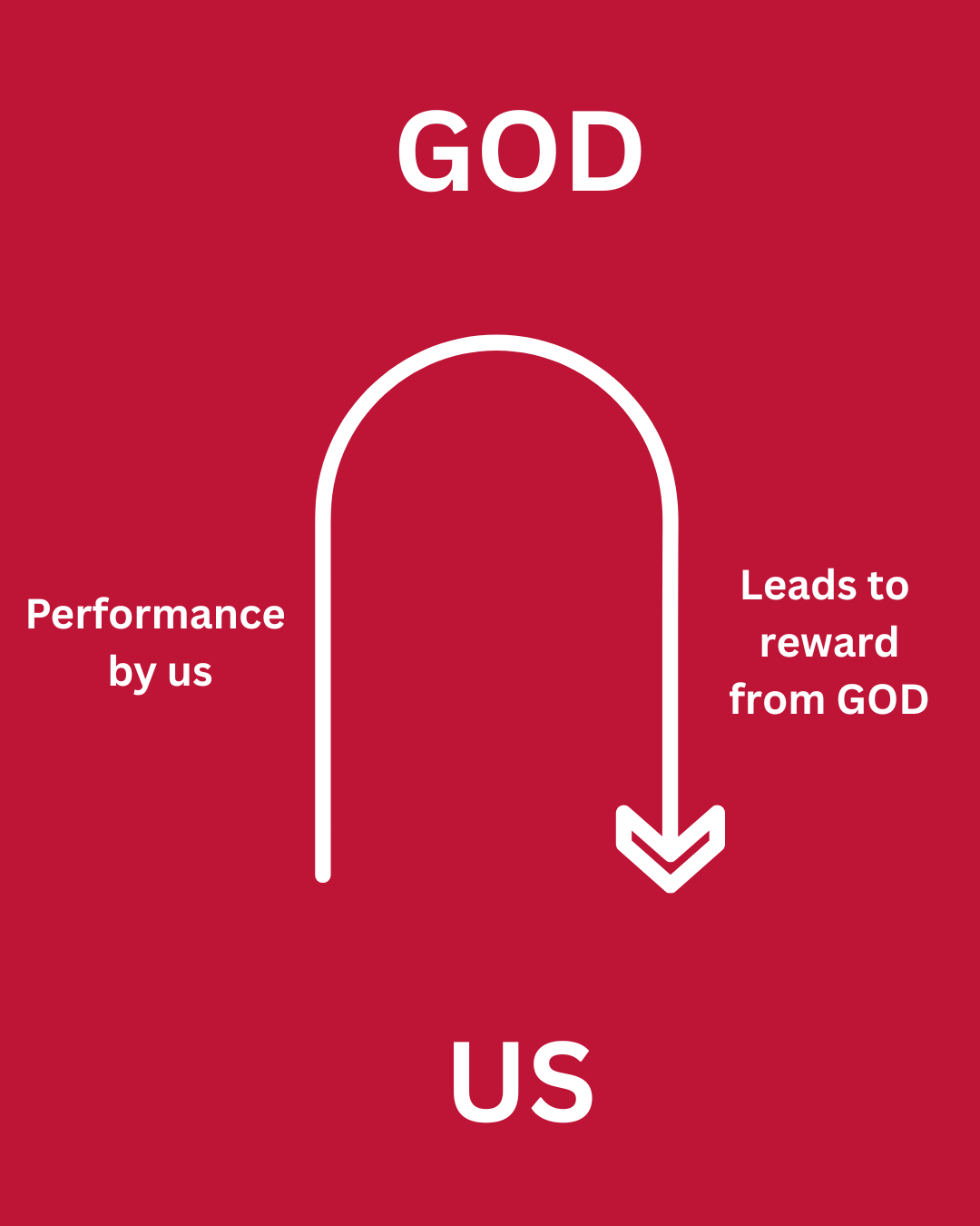 We perform for God and he responds by giving us rewards. It is the N view of God. Our performance might be doing good things (caring for people, charity, being a good person) or it might look religious ( keeping the religious rules, carrying out the religious rituals and practices, supporting the work of the religion with money / time or in other ways). But whether this is thought of in religious terms or just in general terms of goodness, it has at its heart the same fundamental idea - I perform for God and this leads to him rewarding me. It is 100% wrong.